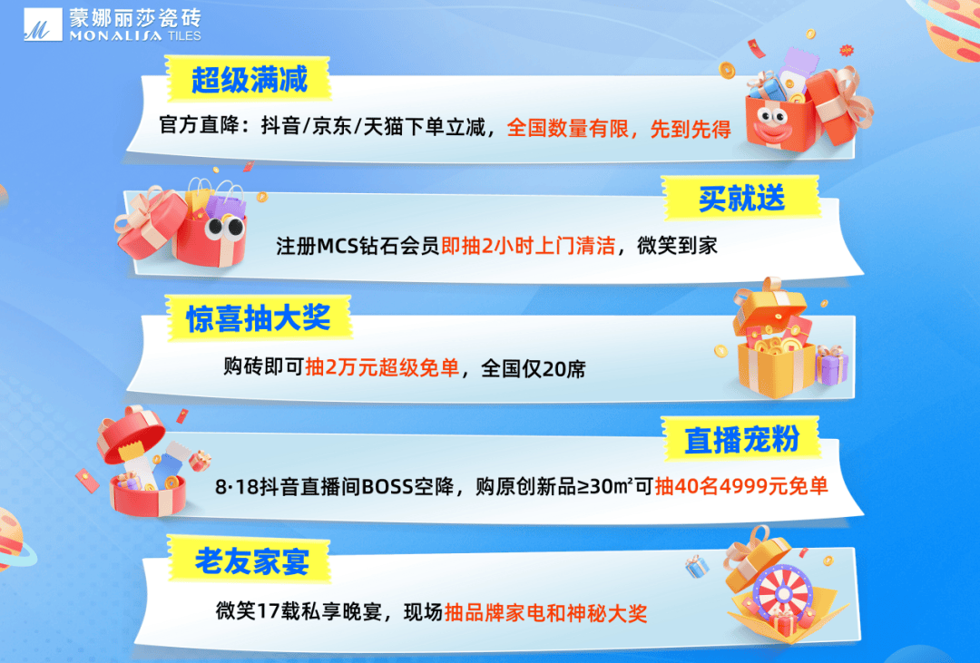 蒙娜丽莎瓷砖第17届浅笑节延续多年的优惠政策。